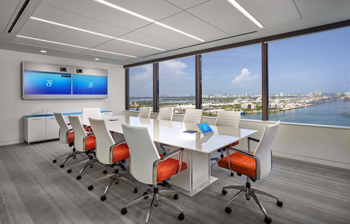 办公室会议室设计:此处与前台相邻,设计师这样设计的目的,是希望会议室可以额外承担起接待、洽谈、交流的作用,设计师的想法就是让一个空间可以多样化,让空间利用达到最大化。